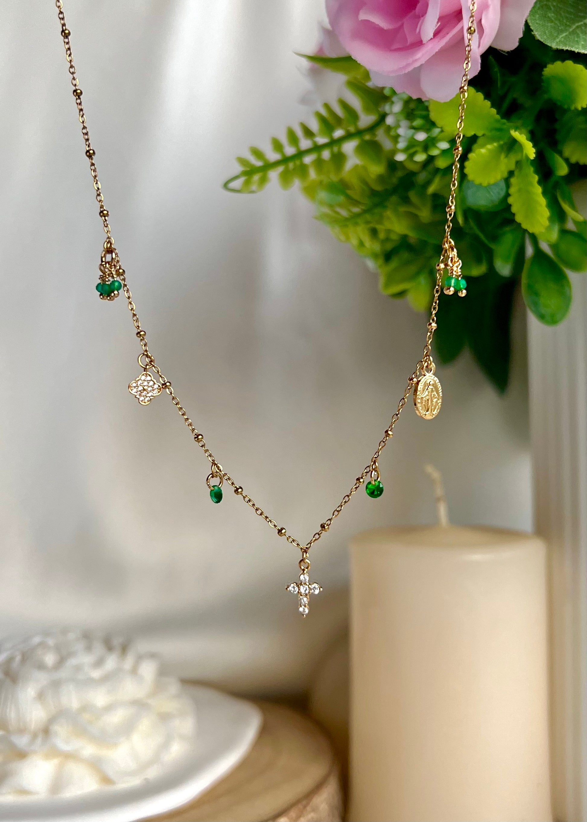 La chaine mesure 40-45cm et elle est en acier inoxydable. Les breloques sont en plaqué or.