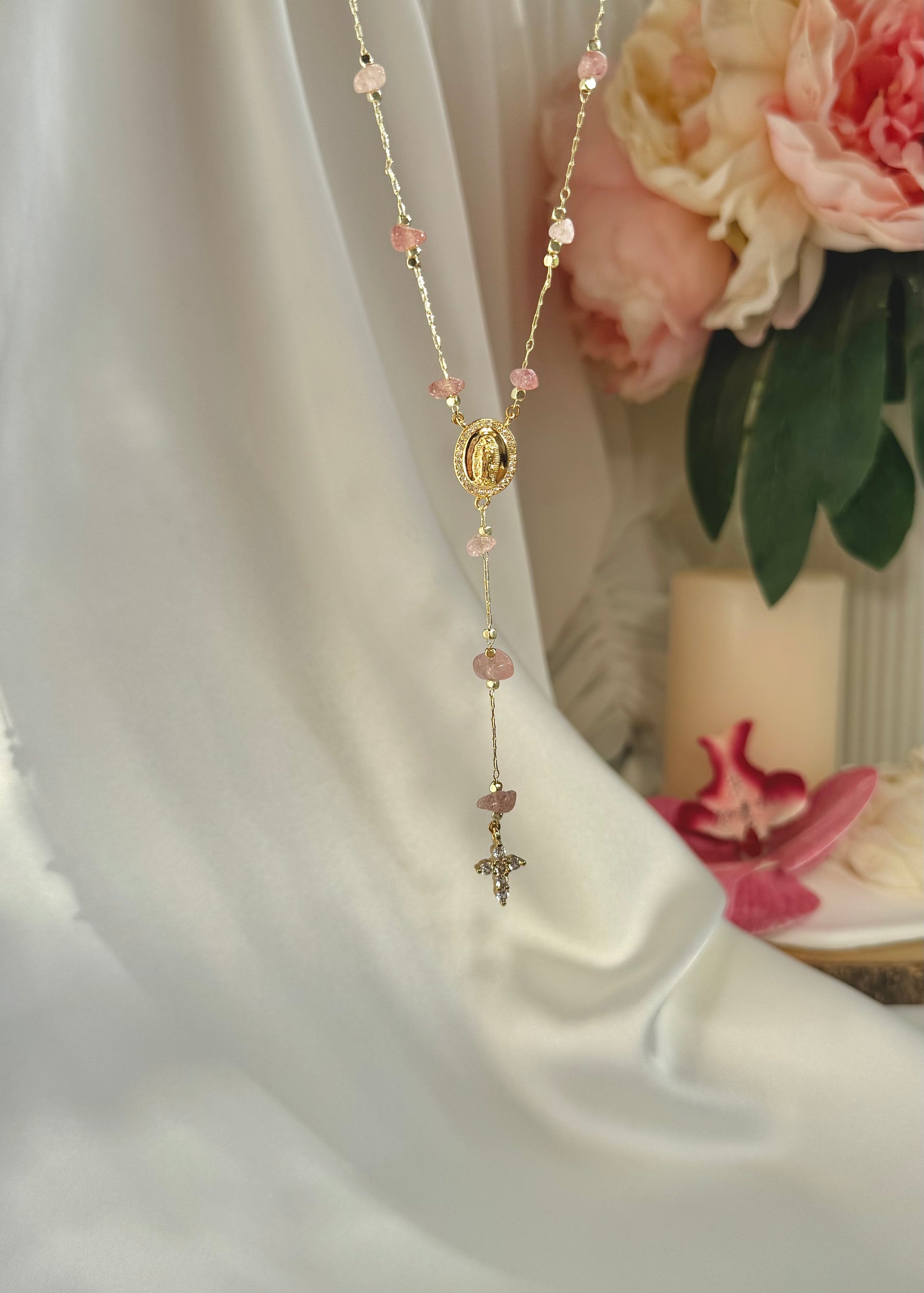 Ce collier est entièrement fait à la main, garantissant une pièce unique que vous ne trouverez nulle part ailleurs. Réalisé en pierres semi-précieuses, ce collier met en valeur une croix brillante en plaqué or ornée de brillant et de la Vierge Marie. Sa finition délicate apporte une touche d’élégance discrète, parfaite pour vous accompagner avec foi au quotidien.