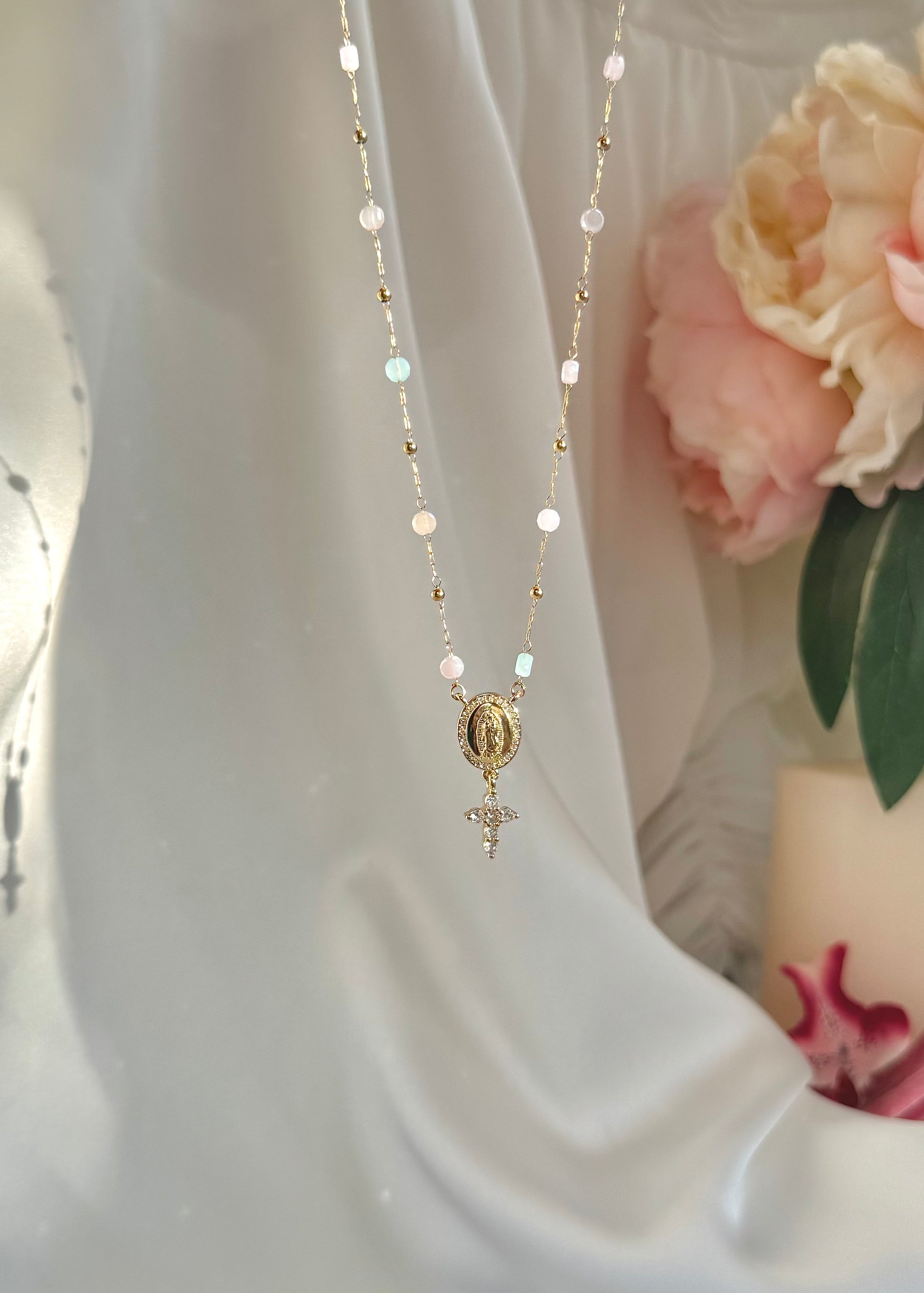 Ce collier est entièrement fait à la main, garantissant une pièce unique que vous ne trouverez nulle part ailleurs. Réalisé en pierres semi-précieuses, ce collier met en valeur une croix brillante en plaqué or ornée de brillant et de la Vierge Marie. Sa finition délicate apporte une touche d’élégance discrète, parfaite pour vous accompagner avec foi au quotidien.