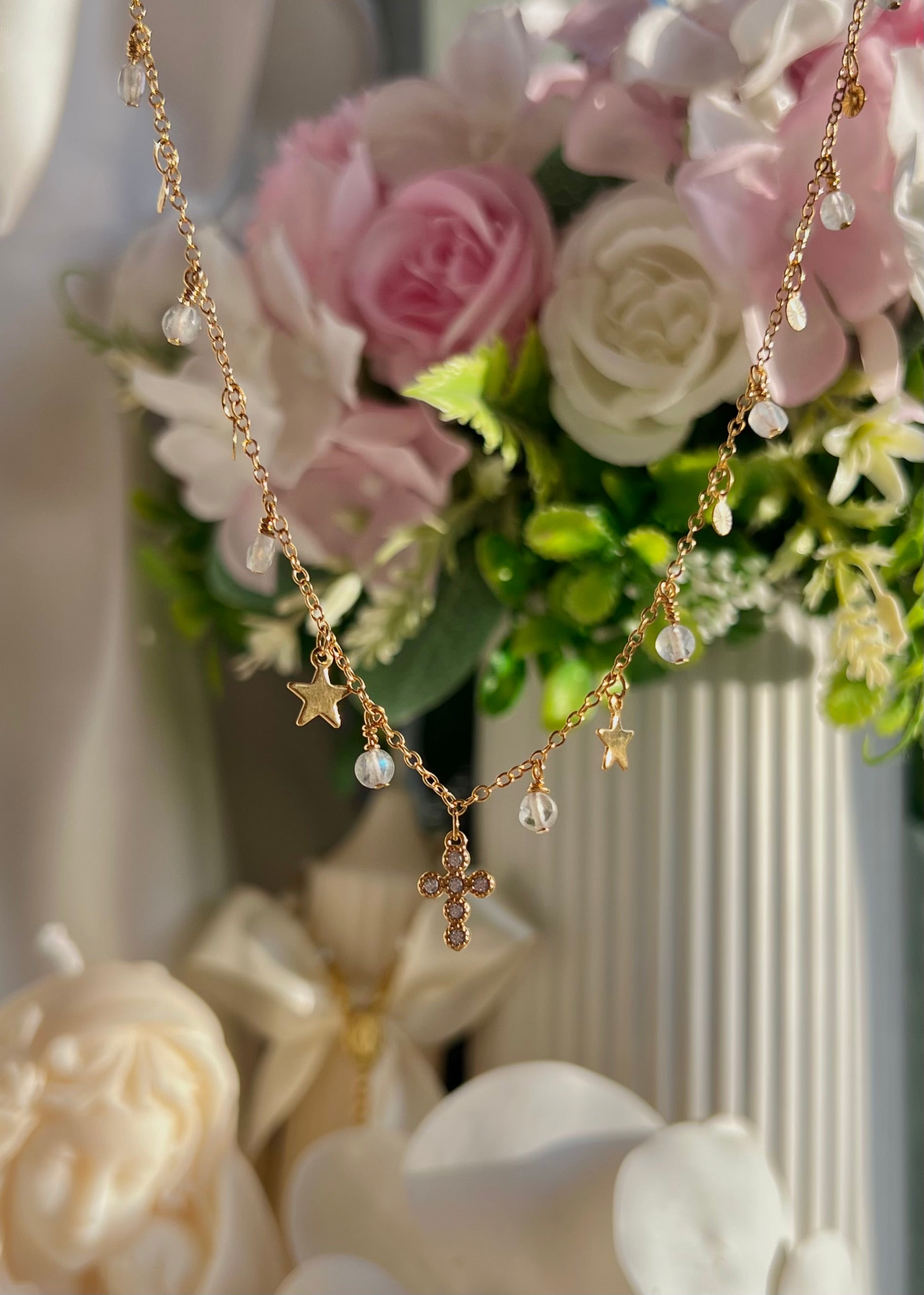 La chaine mesure 40-45cm et elle est en acier inoxydable. Les breloques sont en plaqué or.