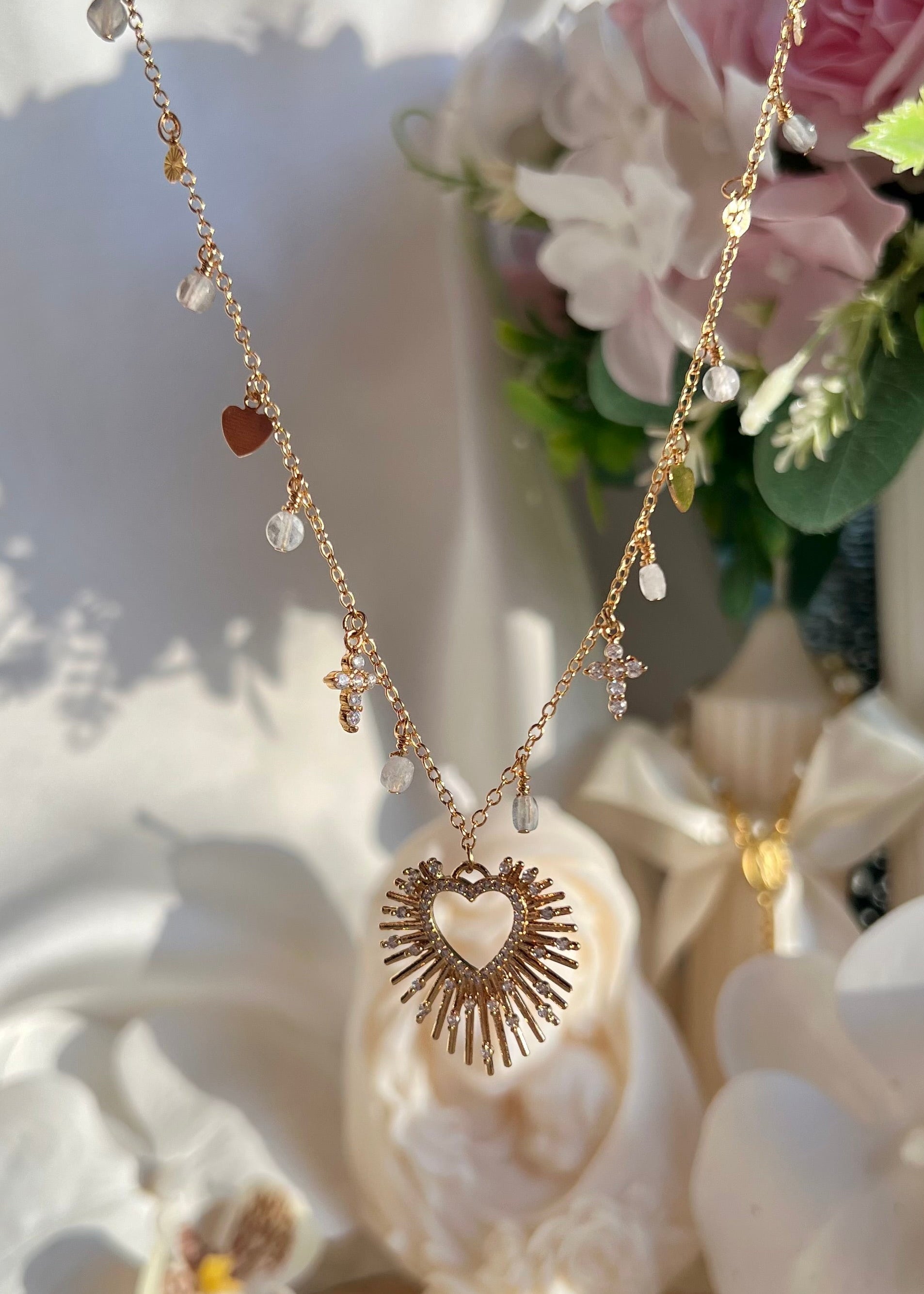 La chaine mesure 40-45cm et elle est en acier inoxydable. Les breloques sont en plaqué or.