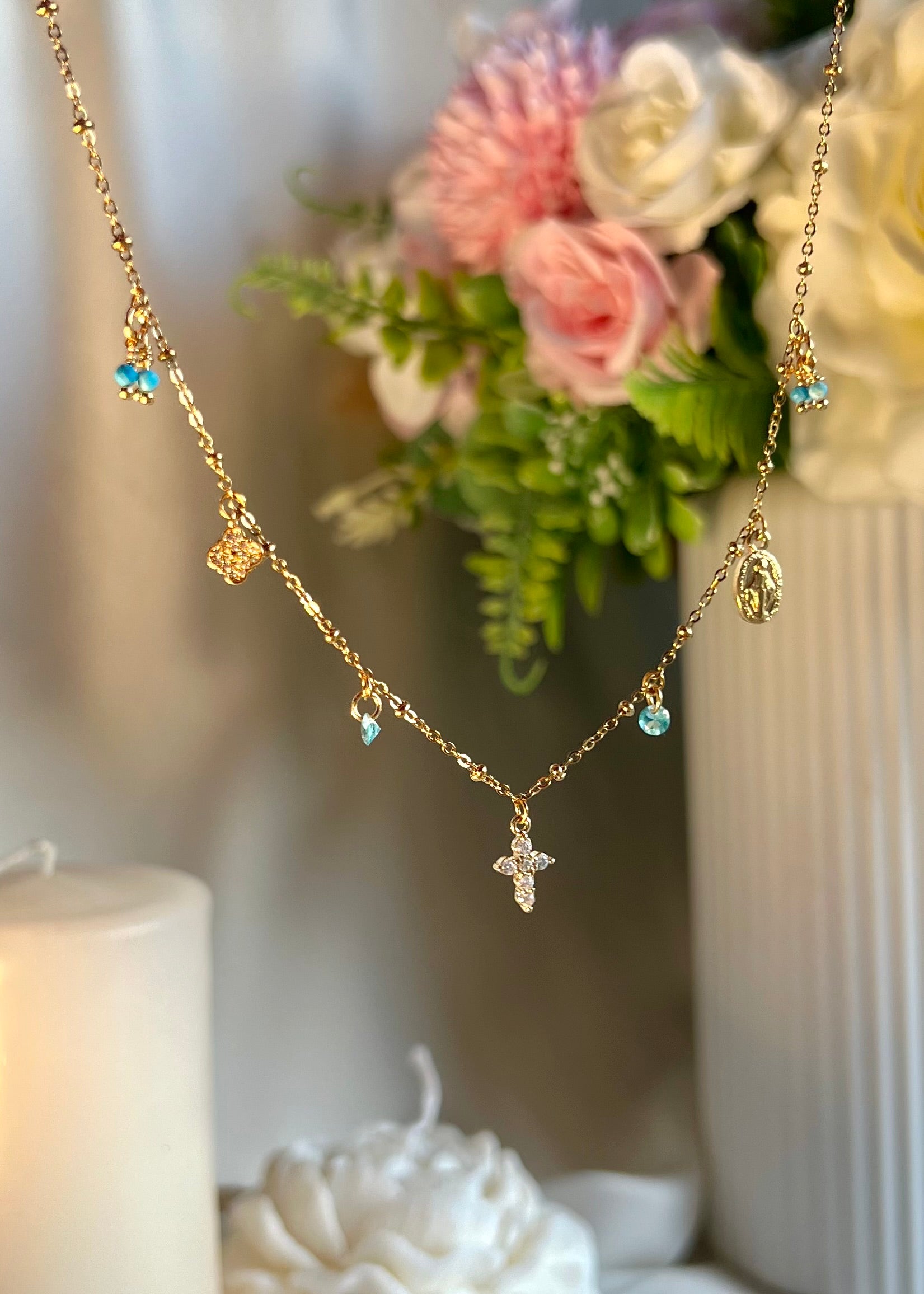 La chaine mesure 40-45cm et elle est en acier inoxydable. Les breloques sont en plaqué or.